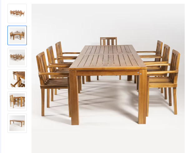 Conjunto de madeira de teca de grau A de jardim. Mesa de 240 cm de comprimento e 8 cadeiras empilháveis.